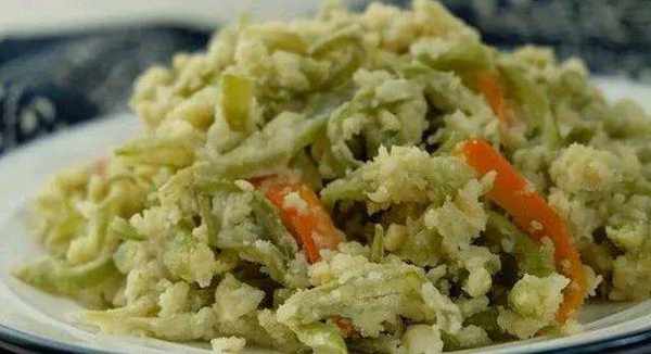 麥飯,應季蔬菜裹上面粉上鍋蒸熟,潑上油潑辣子,亦飯亦菜,一款帶著濃濃麥香味的農傢飯就做好瞭。