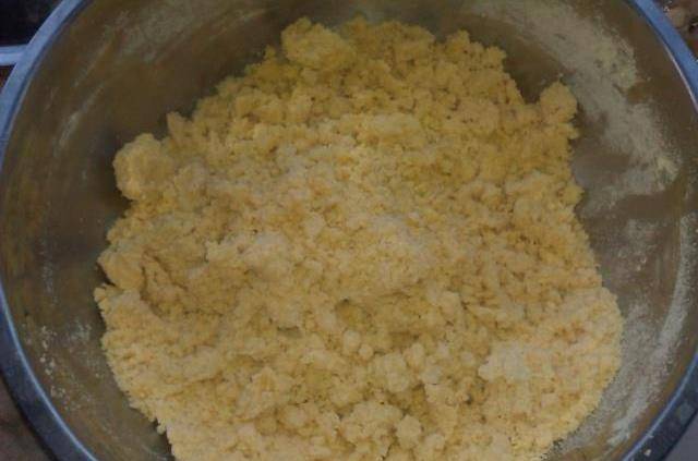 1、將320克黃米粉+160克玉米粉混合均勻後,緩緩倒入開水,將面粉用筷子攪拌如做疙瘩湯一般