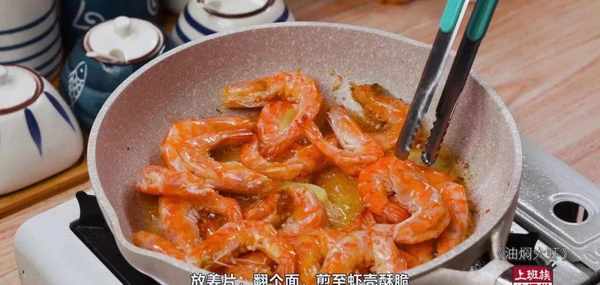 鍋裡油熱下大蝦,煎至大蝦變紅,放5片薑片,翻個面,煎至蝦殼酥脆。