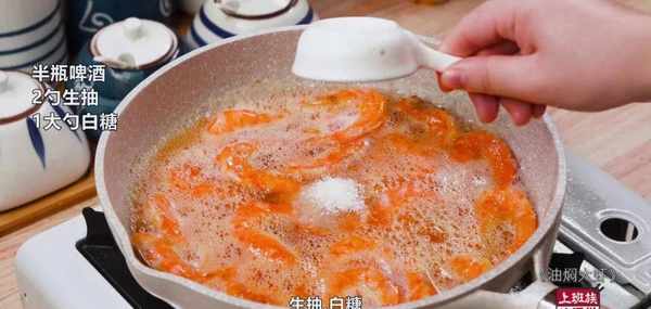 用鍋鏟壓一壓,壓出蝦膏,倒入半瓶啤酒、1勺白糖、2勺生抽,蓋上蓋子用小火燜個5分鐘。