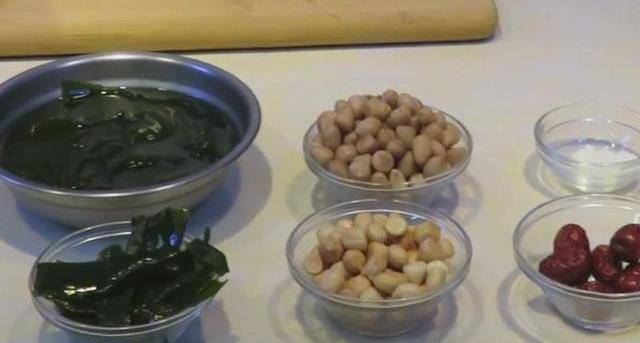 1.我們以海帶結作主材料,還有幹的花生、紅棗,再放兩片薑片。