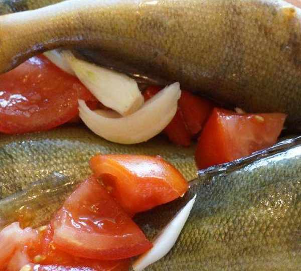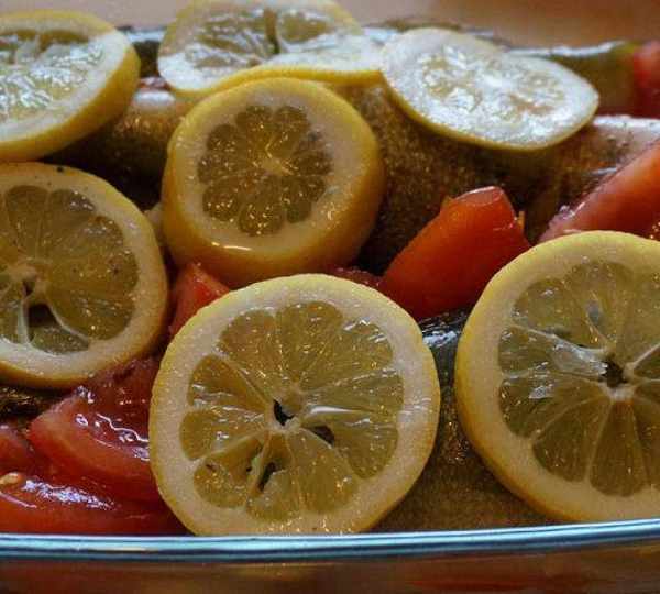 原料:魚、檸檬、番茄、月桂葉、黑橄欖、洋蔥、橄欖油、鹽、胡椒。