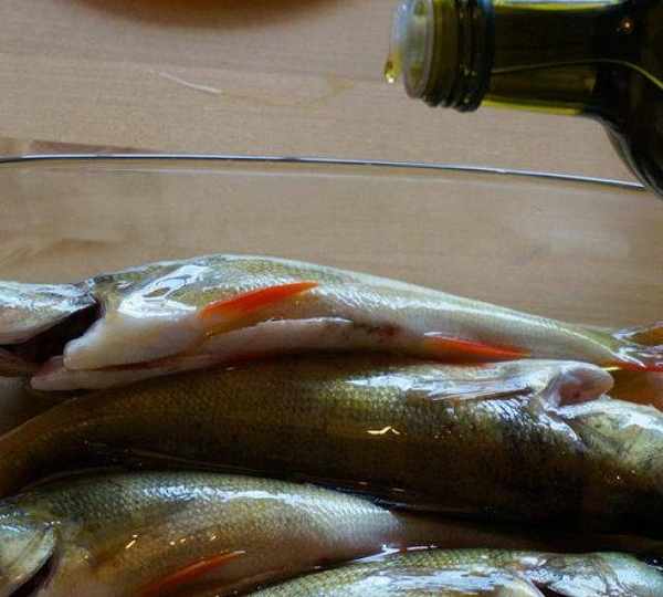 第2步、去除內臟,洗凈的魚放進烤盤裡,撒,在上面撒橄欖油