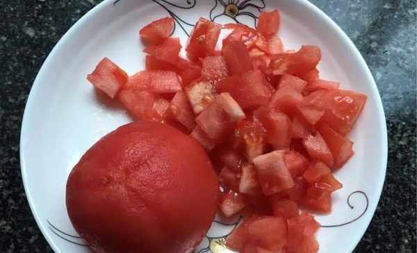 3、西紅柿去皮後切丁,蘆筍次凈後切片;