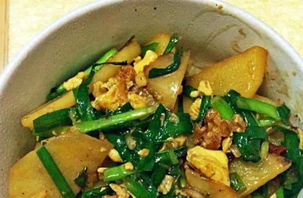 韭菜雞蛋炒土豆:先看看原材料:韭菜切寸段;幹辣椒切段;蔥薑蒜切片。雞蛋打散,炒成塊備用。土豆頂刀切成5毫米厚片,泡入水中。將土豆片撈出,控幹水份,入油鍋炸制5分鐘以上,直到土豆片硬挺,撈出備用。鍋中放油,爆香蔥薑蒜、幹辣椒後,倒入炸好的土豆片,調入15克醬油,加入2湯匙清水,燜制10-20秒。最後倒入韭菜和雞蛋,翻炒20秒即可出鍋享用啦。