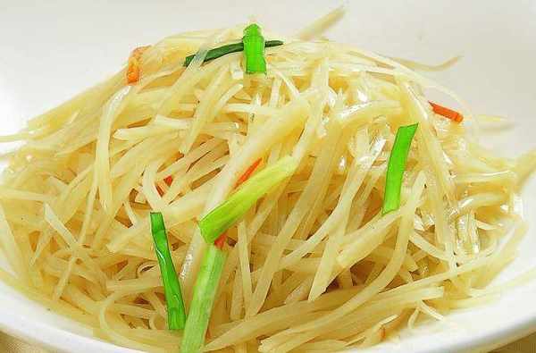 清炒土豆絲,大蔥洗凈切成絲待用,土豆削去外皮洗凈,切成粗細均勻,長短一致的細絲放入大碗中用淡鹽水浸泡片刻,撈出濾凈水分。炒鍋置火上,燒熱後註入花生油,四成油溫時下入土豆絲翻炒二下後下入醋,接著下入精鹽、蔥油、花椒油、蔥絲翻炒成熟即可出鍋裝盤。迫不及待地往嘴裡塞瞭一口,有美食相伴的日子,是十分幸福的!