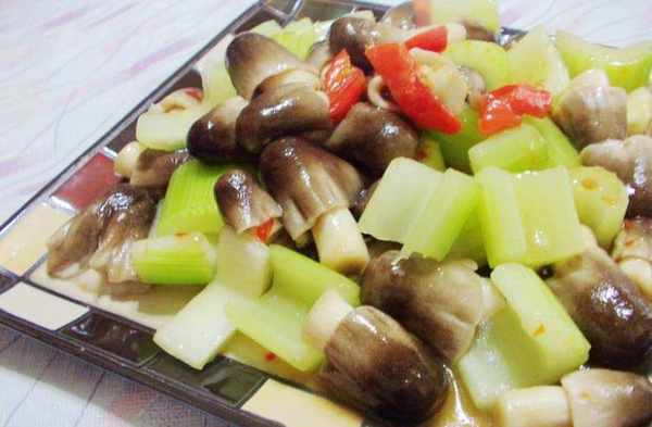 1、將蘑菇切片,西芹切成段,辣椒切片。