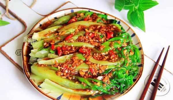 水開加油和鹽,加入生菜焯水撈出。鍋中放油,放蒜末炒香,加入蠔油,白糖,生抽,水淀粉勾芡,最後淋到生菜上即可。