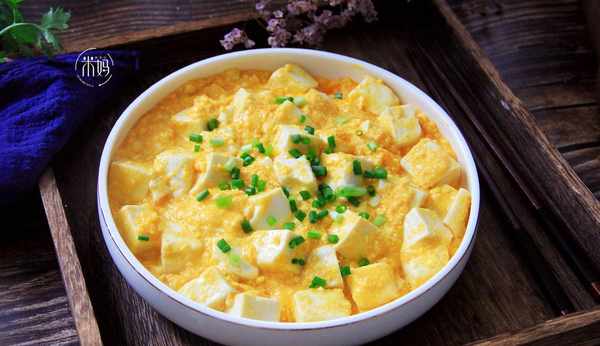 咸蛋黃蒸熟,壓碎,鍋中放油,放咸蛋黃炒出小泡泡,再加入小半碗清水,加入豆腐,加入一勺鹽,少許生抽,最後加入水淀粉,湯汁濃稠即可。