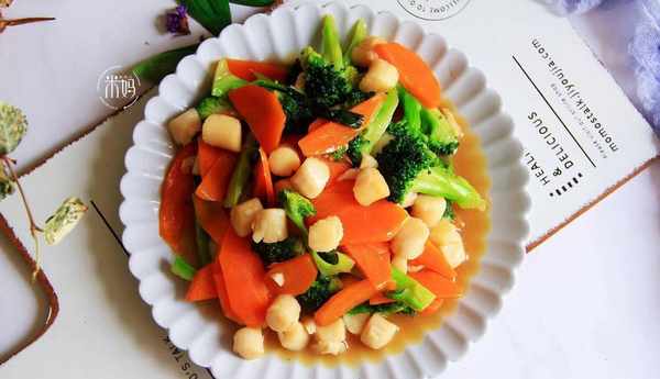 貝柱清洗兩遍,用鹽,料酒,胡椒醃上十分鐘。再放少許生粉抓勻。西蘭花焯水備用。鍋中加油,油放入貝柱快速翻炒,再盛出備用。鍋中放油,放蒜末炒出香味,加入西蘭花,胡蘿卜,貝柱翻炒,最後加入蠔油和少許水淀粉勾芡即可。