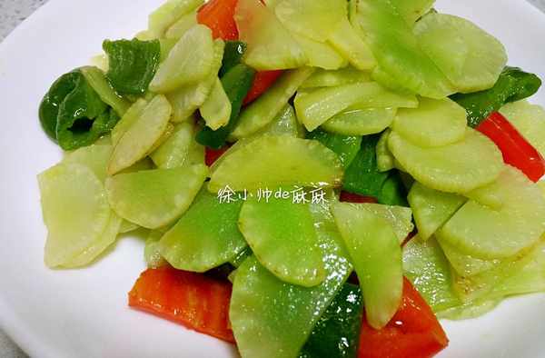 3、將萵筍片倒進去,和青紅椒片翻炒2分鐘即可。可以適當調下味。