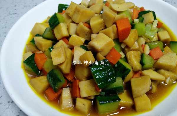 2、鍋內倒入油燒熱,先將胡蘿卜小塊放入翻炒出香味。再將黃瓜小塊和杏鮑菇小塊倒入,和胡蘿卜小塊翻炒均勻。