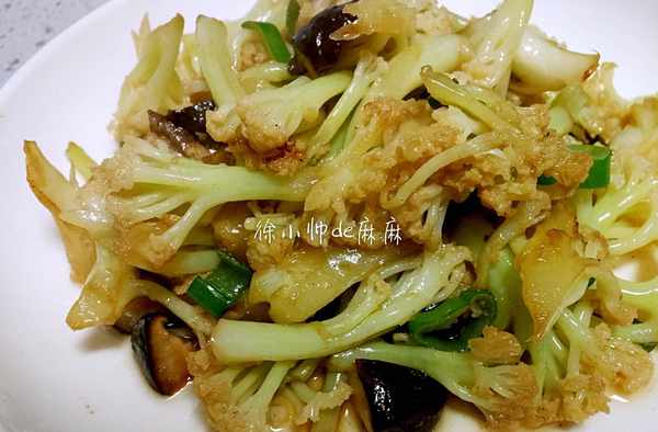 3、熱鍋熱油,倒進瀝幹水的花菜,放一點鹽和生抽將花菜翻炒均勻。將香菇倒進去和花菜翻炒一下,起鍋之前將大蔥翻進去翻炒均勻即可。