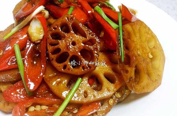 3、熱鍋熱油先將紅辣椒、蒜放進去煸炒出香味,接著將藕片放進去翻炒斷生。將糖醋汁淋倒在藕片上,和藕片翻炒均勻即可。