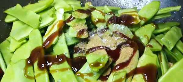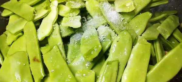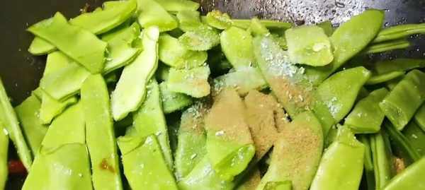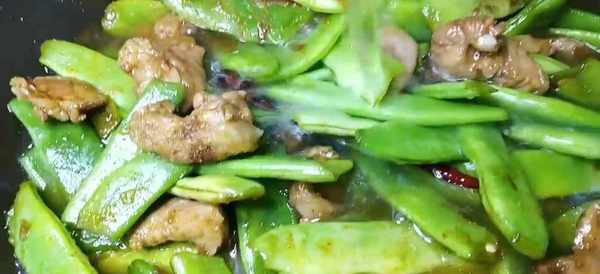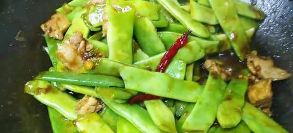 5 放入豆角,繼續煸炒。