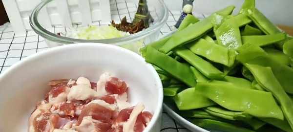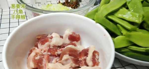 所需食材:豆角,五花肉,寬面,蔥薑蒜,幹辣椒,八角,鹽,雞精,白糖,生抽,老抽,十三香,蠔油