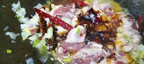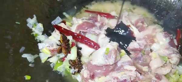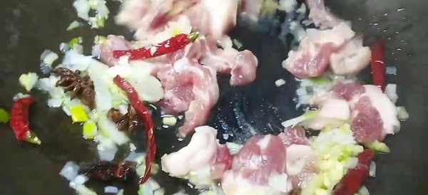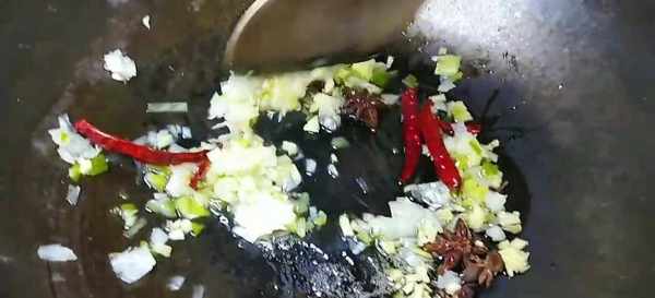 2 起鍋燒油,蔥薑末,八角,幹辣椒爆香。