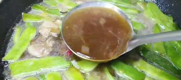 4 以一湯勺為基準,放入一勺料酒,一勺老抽,一勺生抽。煸炒。