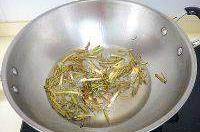 3、熱鍋冷油加小蔥,用中火熬制,把小蔥用筷子劃散開,等熬成這個樣子就熄火,把蔥段撈出來;