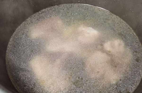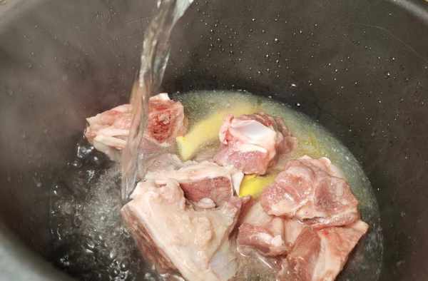 4、把筒子骨倒進高壓鍋,然後加開水進去後靜置3分鐘,讓筒子骨上的淀粉凝固。