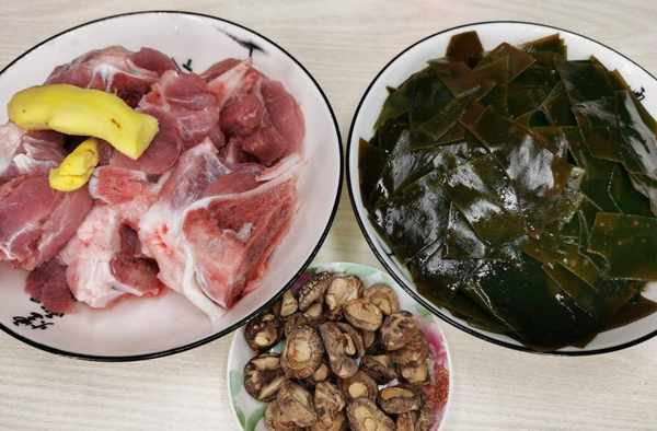 1、要準備的食材有海帶清洗幹凈後改刀切小塊,生薑一塊拍扁,筒子骨,香菇。