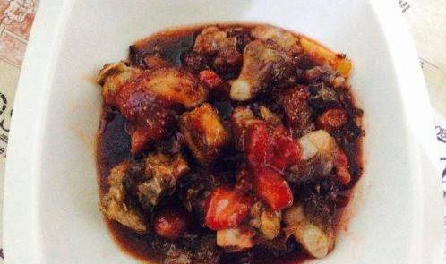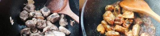 倒入排骨翻炒至要焦後倒入草莓醬,草莓醬要放三大勺,汁要多。翻炒至均勻的裹上草莓醬後放入鹽 生抽,蠔油翻炒,燉的時侯要一直翻炒不要糊鍋,收汁後出鍋。
