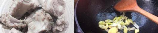 排骨焯水後備用。炒鍋放少許油,油熱後放入蔥薑翻炒出香味。