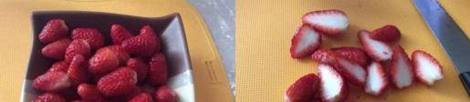 洗凈去蒂。把草莓從中間切成兩半