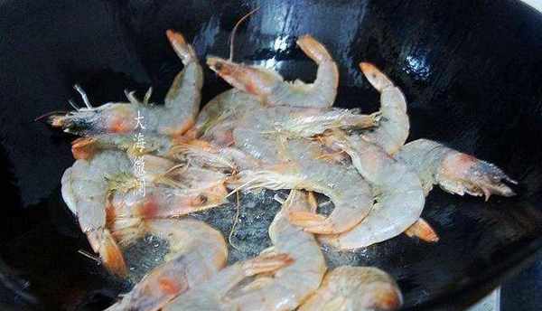 炒鍋加入適量的油,滑入處理幹凈的大蝦,翻炒。