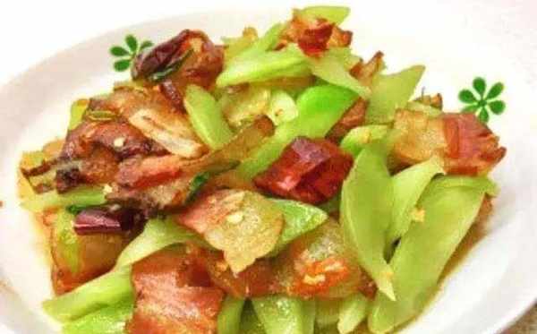 制作:萵筍去皮清洗幹凈,切片,再把鍋裡煮好的臘肉切成小片,準備點幹辣椒,拍扁的蒜瓣和幾片生薑,鍋中倒入油,新鮮辣椒,幹辣椒段都可以,蒜瓣,生薑一起加入鍋中翻炒一下,加入臘肉大火翻炒片刻,再把萵筍倒入鍋中大火翻炒三分鐘,香噴噴的萵筍炒臘肉做好啦!