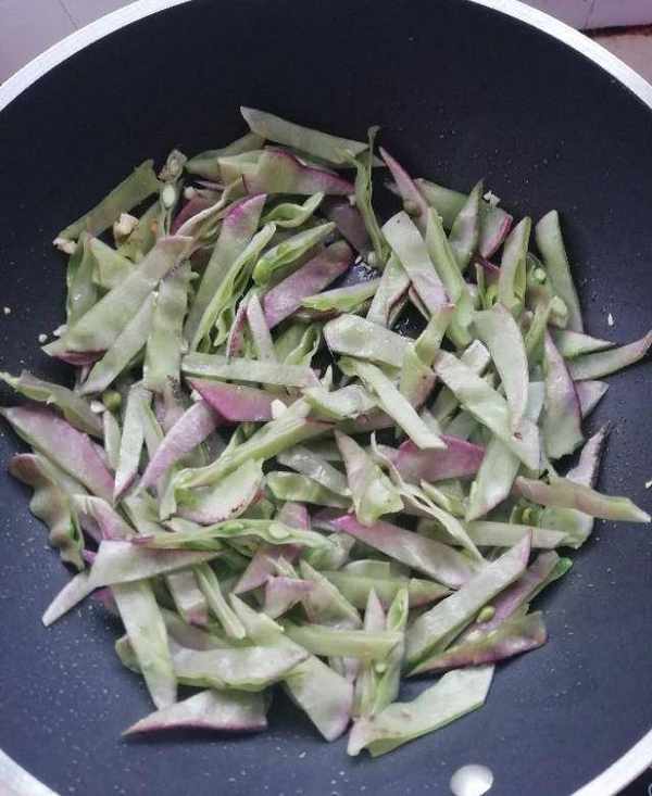 步驟三、鍋裡接著倒入少許油,放入蒜末爆香,倒入紅扁豆爆炒片刻,加入一勺清水,蓋上鍋蓋燜煮二分鐘左右。