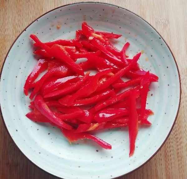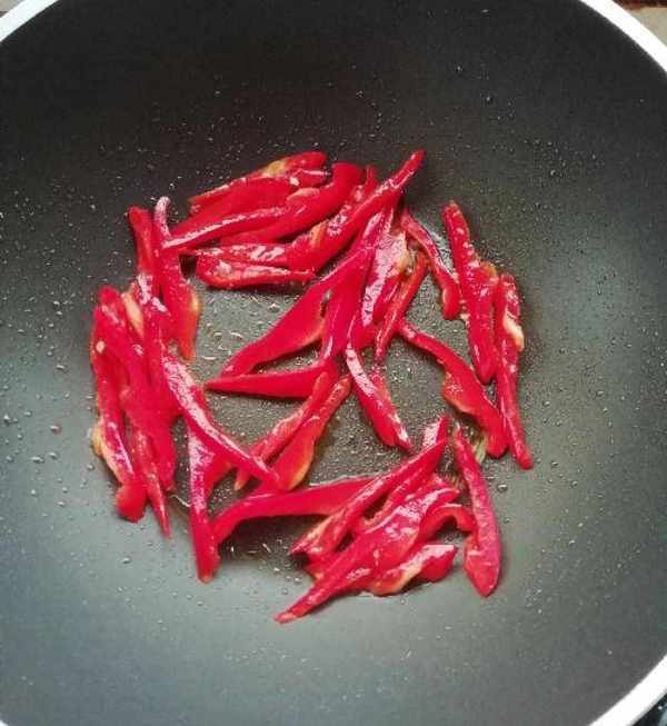 步驟二、起鍋倒入少許油,油熱時放入紅尖椒快速煸炒幾下,打起來裝盤備用。