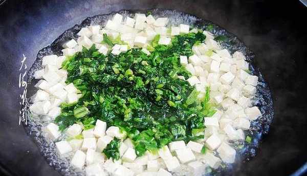 鍋中加入適量的水,水開下入豆腐丁,煮開。