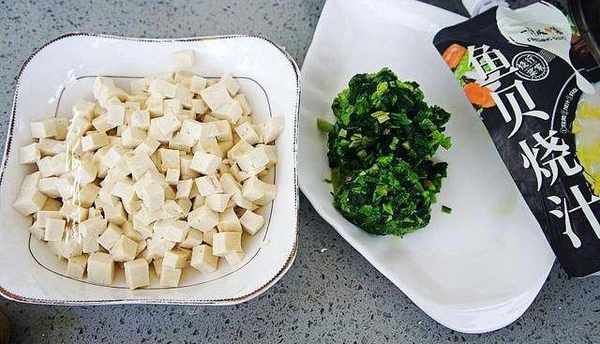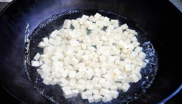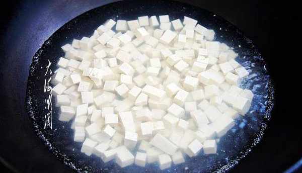 豆腐切丁,過水焯一下。豆腐的營養價值極高,高蛋白,低熱量,低脂肪,雖然是大豆制品,但由於豆腐在加工過程中加入瞭鹵水,從而讓豆腐中鈣、鎂的含量比大豆更高,是補充身體鈣元素的營養佳品。