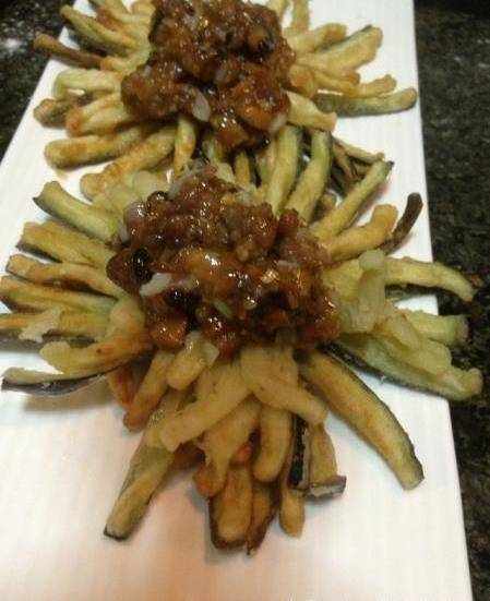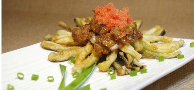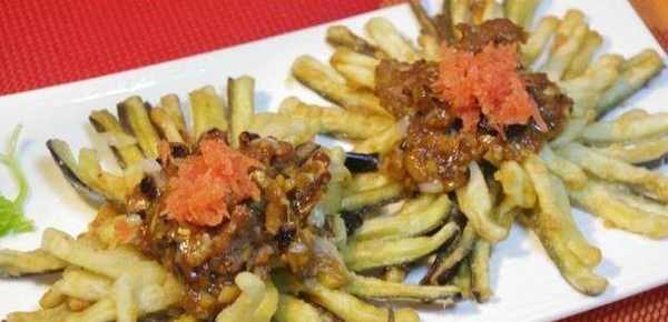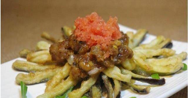 將肉末淋在茄子上在放入胡蘿卜泥做裝飾