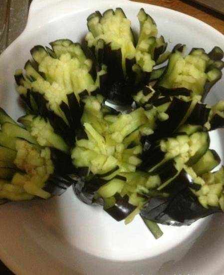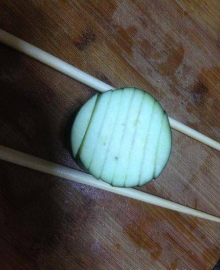 茄子縱橫交錯切但不要切斷,用2根筷子放下面,這樣就不用擔心切斷喔