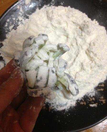 準備一盤面粉,茄子捏掉多餘的水分後,每朵茄子均勻蘸上面粉(普通面粉均可)