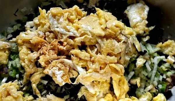 2:把蘿卜清洗幹凈,切成小碎末放在碗中作為備用,在小碗中打上雞蛋2個,放上一點食鹽攪散,在鍋裡倒上食用油,把雞蛋液倒進去炒碎,木耳提前泡發好切碎放在蘿卜碗中,把雞蛋碎也放進去,加上醬油、蠔油、十三香、香油攪拌均勻(先不要放食鹽,食鹽是最後放)。
