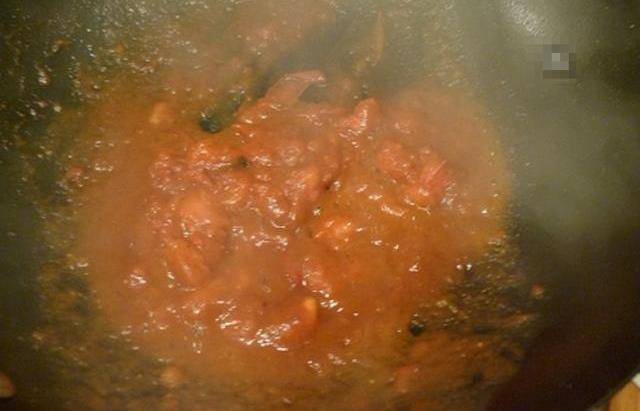 然後放上一個熱鍋,熱鍋裡面倒少量的油,比炒菜的時候少一點就可以瞭。等到油燒熱瞭之後,再把蔥末倒進鍋裡面,蔥末出瞭香味之後,我們再把西紅柿塊放進鍋裡面,翻炒一分鐘。然後就可以在鍋裡面倒一些番茄醬瞭,再把鹽和糖也倒進去,然後開中火,用中火翻炒鍋裡面的食材。炒一會兒,鍋裡面就會出現紅油,我們可以明顯的發現,西紅柿的塊好像減少瞭,這個時候就可以倒入半鍋的清水瞭,然後再用大火把鍋裡面的番茄和水都燒開。