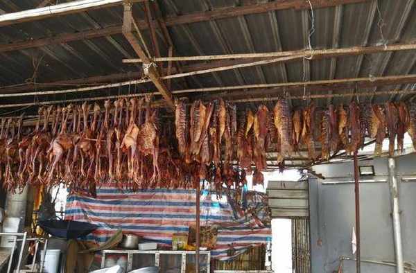 同伴看到第一眼就要買,老板稱這隻是半成品,趁著太陽涼曬,還需煙熏後才香哩。