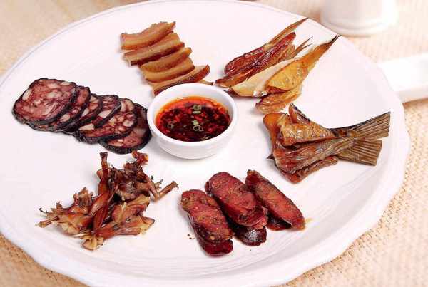 臘味合蒸:如今的臘味合蒸已經不僅僅局限於臘肉、臘雞、臘魚的黃金組合,更多臘制品加入其中,這款臘味合蒸就是將豬血丸子、臘田雞、臘肉、臘腸、臘魚尾和臘魚塊分別蒸熟後拼成一盤,配自制辣椒醬上桌蘸食。