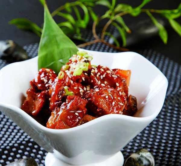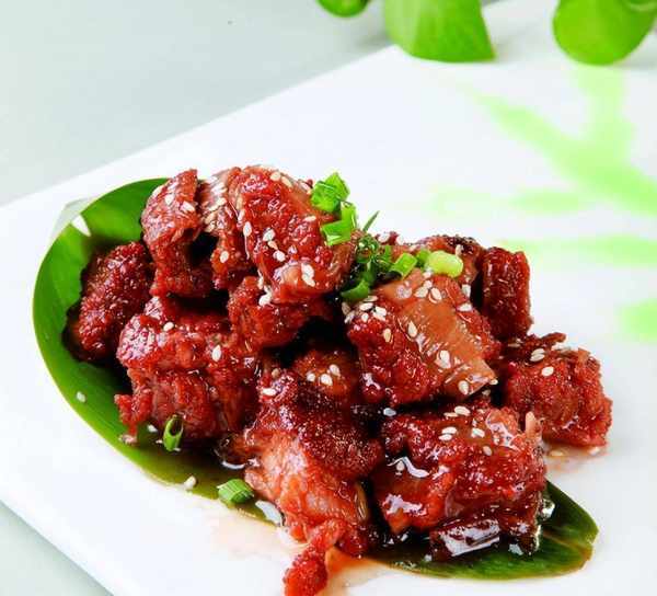 6:取砂鍋加入排骨醬汁300克燒開然後加入炸好的排骨煨至5分鐘左右待湯汁濃稠出鍋裝盤紅薯絲和青檸檬點綴即可。