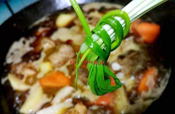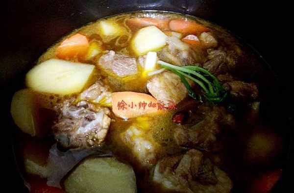 3、倒入準備好的土豆和胡蘿卜塊,翻炒均勻,然後倒入沒過排骨的開水,將香蔥打結放進去大火煮開,將煮開的排骨和土豆倒入電壓力鍋內,電壓力鍋按肉\雞按鈕即可。