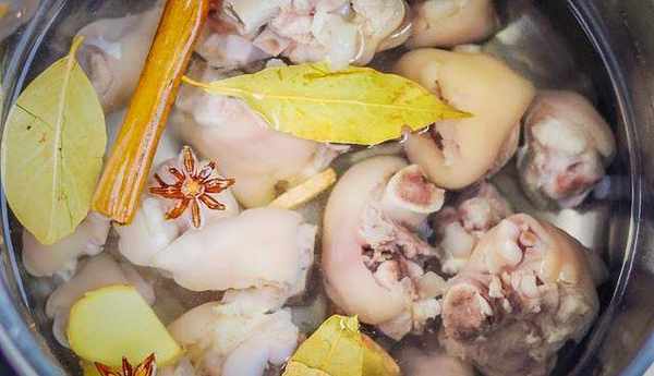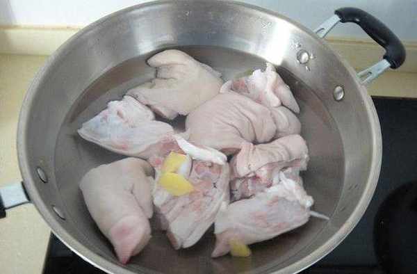 豬蹄買回來以後,我們先用冷水將它沖洗幹凈,然後將它斬成塊。在國內燒一鍋水,等水開以後,我們將豬蹄放入開水中焯水,註意焯的時間不要過久。等水再次翻開後,我們就可以將豬蹄撈出瞭,焯水的時候要攪拌一下,讓它們受熱均勻。