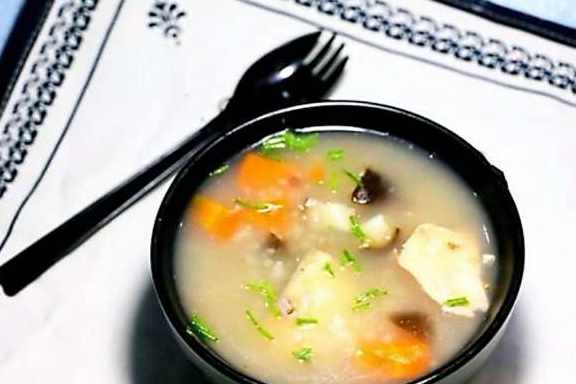 食材:大米,魚肉,香菇,香菜,胡蘿蔔,鹽適量,料酒,白胡椒粉,生抽,澱粉,香油少許。