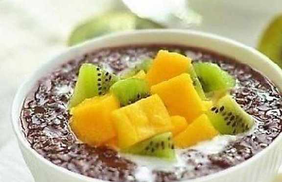 食材:黑米,糯米,芒果,奇異果,椰漿2大勺,白糖適量。