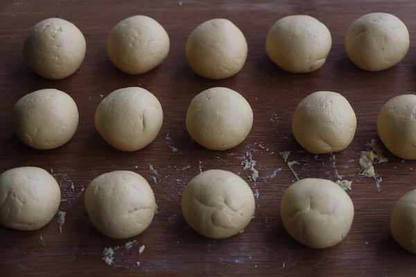 3、面團搓成長條,分成大小一致的小面團;