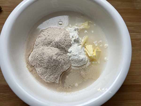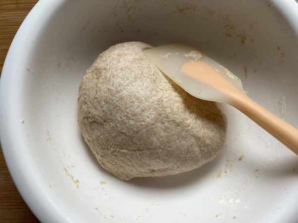 食材:全麥高筋粉150克,面包粉150克,酵母3克,糖5克,鹽3克,水175克~210克,黃油15克。