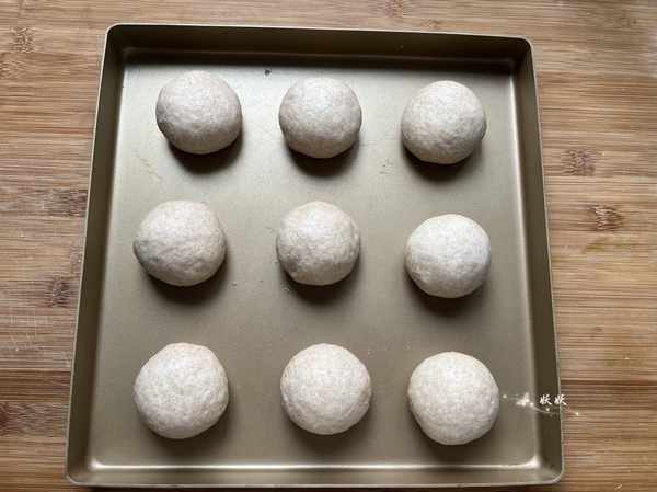8,分別滾成圓形,光滑的一面朝上,擺入烤盤中,可以借助烤箱的發酵功能來發酵。