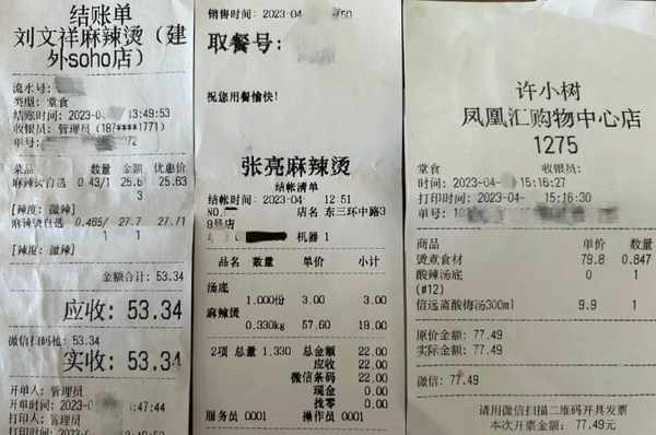 隨後在取餐時,盡管小票被作為取餐憑證收回,但能主動提供小票,也實屬不易。畢竟在隨後來到的張亮麻辣燙、劉文祥麻辣燙門店和許小樹門店裡,隻有許小樹提供瞭小票。另外兩傢的收銀員在給菜品稱重之後,完全沒有絲毫主動提供小票的意思。